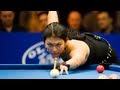 In the second semifinal match, Jeanette “The Black Widow” Lee and Line Kjorsvik of Norway had less of a lopsided bout. Lee took the first game after Kjorsvik missed the 6 and then broke and ran the next to take an early 2-0 lead. However, Kjorsvik countered, capitalizing on errors by Lee in two consecutive racks to draw even. They traded the next four games, which were peppered with safety battles, to make it 4-all. A nicely played 4-9 carom put Kjorsvik ahead briefly, but Lee quickly returned to form when Kjorsvik missed the 3 ball in the following game, allowing Lee to make it 5 apiece. Attempting to reach the hill, Kjorsvik ran out to the 9 ball but got out of line and missed, handing the hill to Lee instead. In the final rack, Kjorsvik was forced to jump to hit the 8 ball and left a tough long shot for Lee. Undaunted, Lee stepped up and coolly pocketed the 8 and 9 to reach the finals.